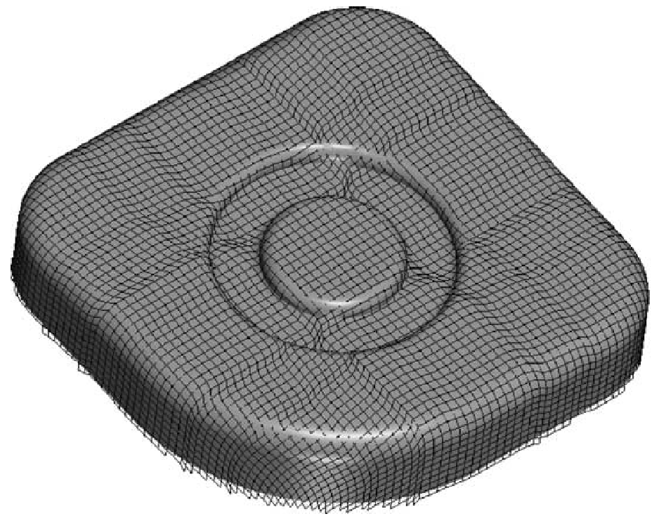 With the removal of all mechanical and weaving considerations, the results are identical whatever the stiffness of the rovings and the weave chosen. Kinematic blocking in shear and thickness variation in compression are also absent from the basic model. The absence of developed contact prevents the use of external tools such as blanket clamps, which are necessary for some shaping. For woven reinforcements, the net algorithm is interesting as a preliminary approach to determine the degree of complexity of forming a part. An example of application on a non-developable part is given in the next figure.