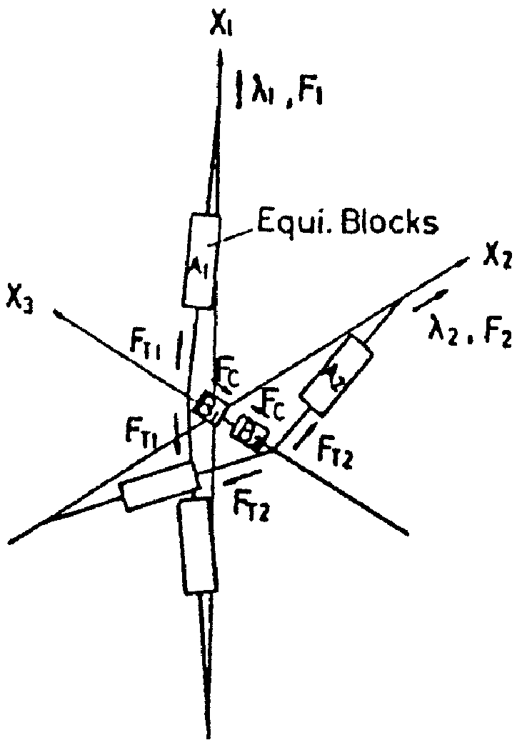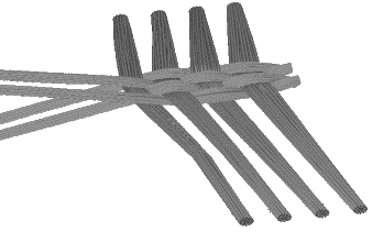 The next figures shows an example using this type of approach proposed by Kawabata 21. The roving is described by a set of segments schematizing its mean line: these segments then form a set of elastic tensile bars representing the whole woven reinforcement. The interactions between the rovings at the crossing points are modeled by springs of different types.