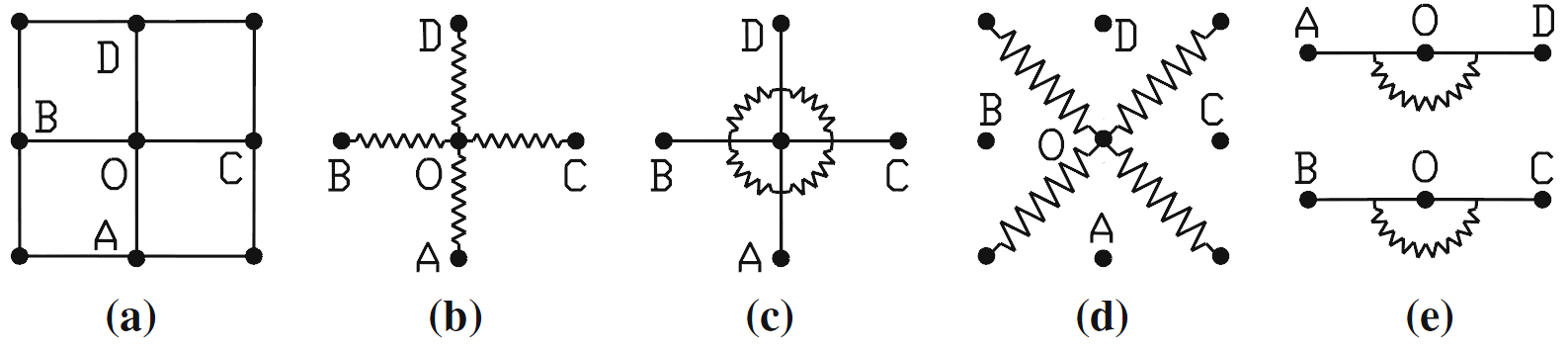 The discrete approaches consist in considering the textile as a discontinuous assembly of deformable elements 36. They are generally extensions of the net theory, i.e. the introduction of mechanical characteristics in the solution of the shaping problem. The reinforcement is modeled by nodes connected by bars and springs with the aim of modeling the response in elongation, shear, torsion and bending. The work of Sze and Liu 37 is particularly interesting on the variety of solicitations modeled for 2D dry reinforcements, as illustrated in the following figure. These approaches, generally encountered for clothing fabrics, are abandoned in favor of semi-discrete or continuous methods in the case of technical fabrics.