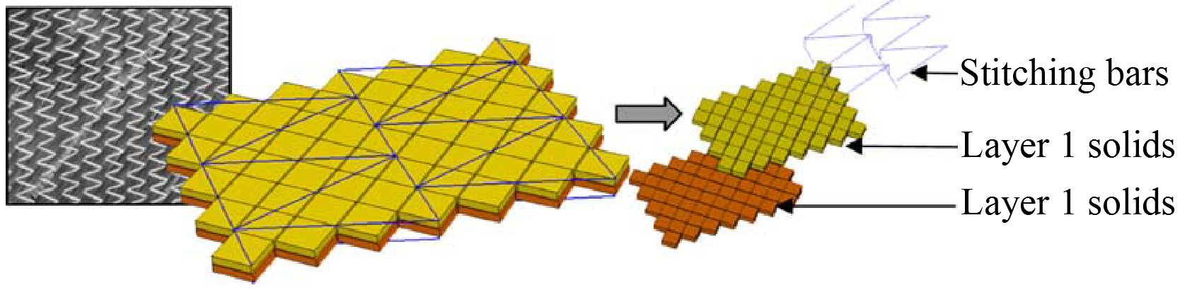 Une autre philosophie de modélisation considère les parties discrètes et continues comme totalement indépendantes. C'est le cas, par exemple, de travaux sur les NCF 67. Ces tissés spécifiques sont constitués de nappes cousues. Dans cette modélisation, les nappes de mèches sont représentées par des couches d'éléments solides tandis que des éléments barres sont ajoutés pour représenter les coutures. Ici, les parties continues sont totalement découplées des parties discrètes, impliquant la gestion du contact entre les nappes et les coutures.