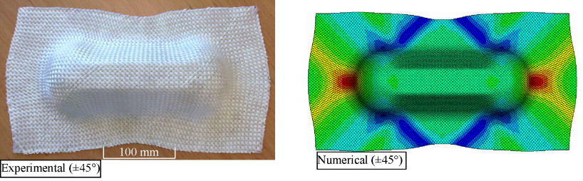 Différentes approches, qu'elles soient hypoélastiques 40 41 42 ou hyperélastiques 43, ont donné des résultats probants. Ces lois sont associées à des éléments coques ou plaques pour les tissés fins. Ces méthodes présentent l'avantage de pouvoir être utilisées facilement dans des codes éléments finis commerciaux. Leur inconvénient principal provient justement de l'homogénéisation qui est réalisée. Le même matériau est appliqué en tout point du renfort fibreux à modéliser et ne prend pas en compte les variations des caractéristiques mécaniques inhérentes à l'armure étudiée.