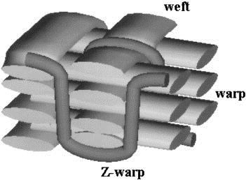 Dans le cas de tissés 3D et 2.5D, les mèches de trame croisent plusieurs plans de mèches de chaîne dans l'épaisseur du matériau. Le tissé obtenu peut alors atteindre des épaisseurs de l'ordre de la dizaine de centimètres et permet d'éviter le délaminage. 10: