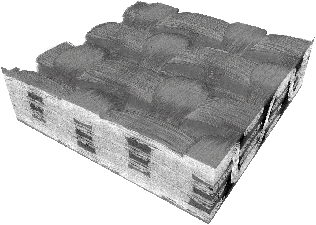 La microtomographie X est la méthode la plus prometteuse pour accéder expérimentalement à la géométrie d'une maille élémentaire 25 26 27. Cette technique consiste à scanner un échantillon représentatif d'un renfort afin d'en obtenir une cartographie 3D puis de traiter les images obtenues en découpant les éléments constitutifs (les mèches), en les séparant les uns des autres et en les maillant. La microtomographie a le grand avantage de pouvoir conduire à des modélisations libres d'interpénétrations si les traitements numériques appropriés sont réalisés 28 29.